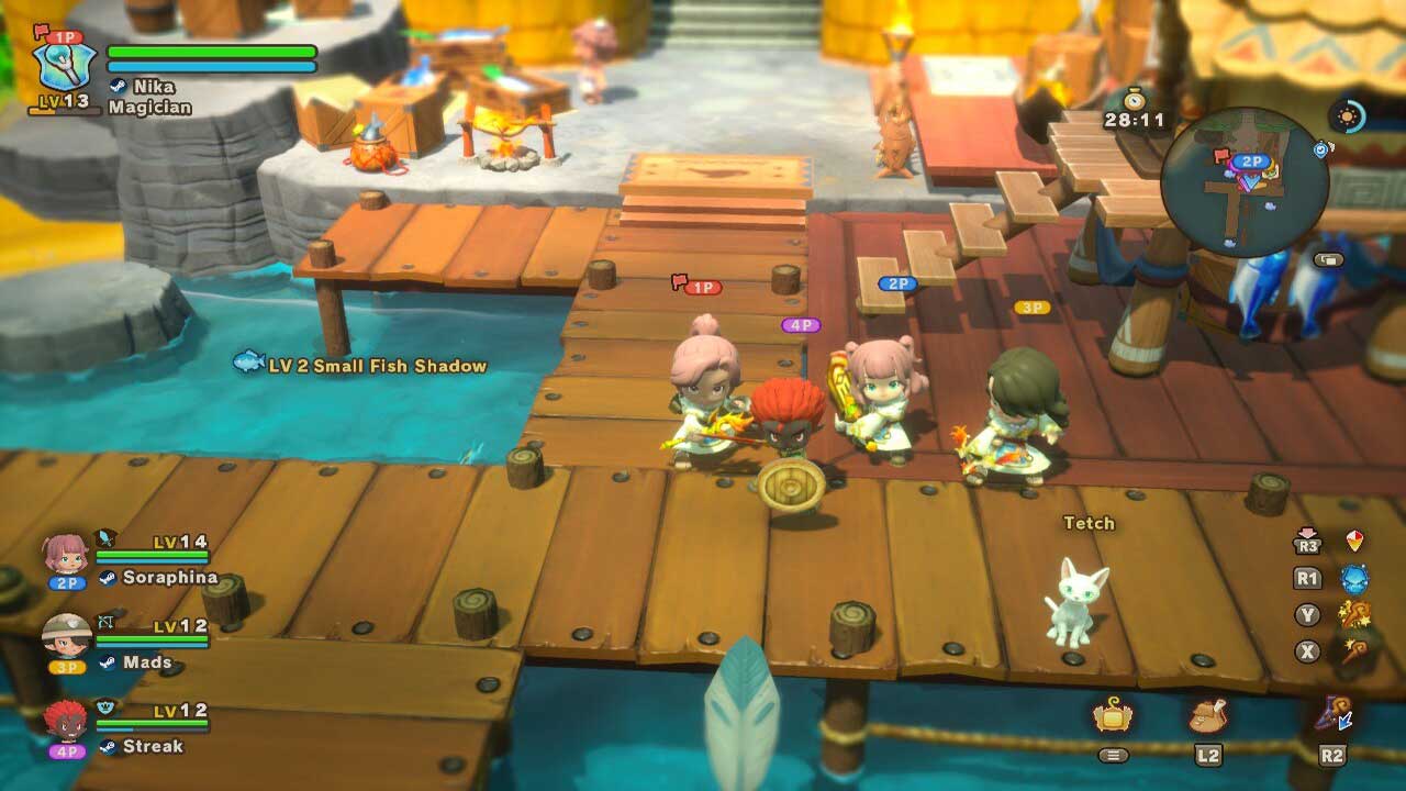 در نهایت یک بخش چندنفره نیز برای بازی وجود دارد، اما تا به حال جذابیت اصلی آن برای من نبوده است. در حالت شبکه، یک دوست میتواند وارد بازی شود و شریک خود را در یک حالت جانبی باشکوه دوران Wii کنترل کند، جایی که بازیکن دوم واقعاً نمیتواند کار زیادی انجام دهد. در حالت آنلاین تا چهار بازیکن، نمیتوانید کاری با داستان انجام دهید. بهتر است از آن برای گشت و گذار در Ginormosia یا سیاهچالهای proc-gen در روستای خود استفاده کنید. حتی در آنجا، نمیتوانید به برجها یا معابد Ginmormosia دسترسی داشته باشید. این یک تجربه محدود است، اگرچه توسعهدهنده در حال ایجاد تغییراتی در آن است.