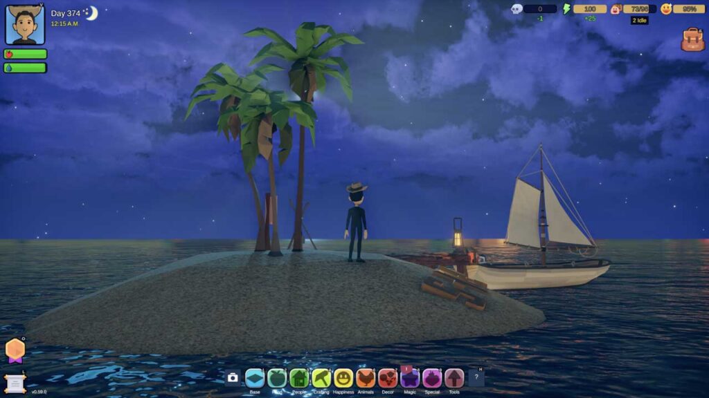 شما از یک جزیره شنی کوچک شروع می کنید، با اشیاء مختلف شناور روی آب برای جمع آوری که هر از گاهی ظاهر می شوند. این اشیا شامل تخته های چوبی، برگ ها و ماهی های کوچک است که به عنوان منابع اولیه شما محسوب می شوند. فقط زمانی که به اندازه کافی به آنها نزدیک باشید، می توان منابع را انتخاب کنید – خط هدف انتخاب آنها بین رنگ سبز در محدوده و قرمز اگر خیلی دور باشد تغییر می کند و از این طریق می توانید بفهمید کدام یک را می توانید جمع آوری کنید. گاهی اوقات جعبههای شناور روی آب را می بینید که شامل مجموعهای تصادفی از آیتمهای مفید است.