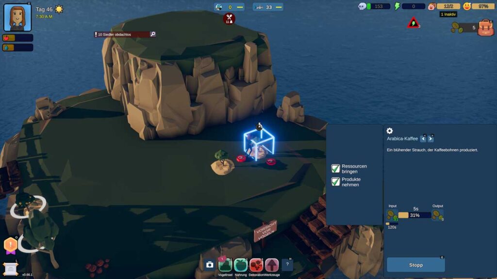 علاوه بر این، مهاجران بیشتر به معنای تقاضاهای بیشتر است. هر تازه وارد به غذا و آب کافی برای کارآمد بودن، همراه با زمانی برای استراحت و تفریح با فعالیت های اوقات فراغت مانند رقص نیاز دارد. بهطور پیشفرض، مرگ ساکنان غیرفعال است، اما میتوان آن را مجدداً روشن کرد تا کاراکترهای گرسنه و تشنه از بین بروند. اما با وجود ماهی های بسیار در دسترس و سهولت تصفیه آب، این مسئله نباید مشکل ساز باشد مگر اینکه کلنی کاملاً از نظر اندازه منفجر شود. خوشبختانه بازی Havendock شامل یک دایره المعارف ساخت بزرگتر است که توضیح می دهد که هر منبع چگونه ساخته شده است و برای چه چیزی استفاده می شود.