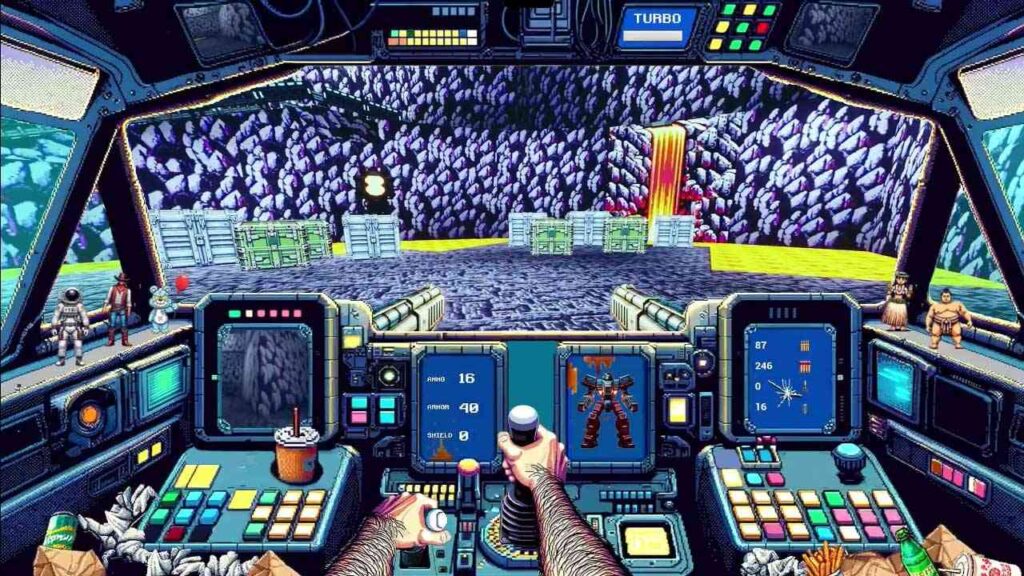 در ادامه مستقیماً وارد گیم پلی بازی می شوم. چندین المان برجسته وجود دارد که ارزش بررسی کردن را دارند. کابین ماشین شما به طرز باورنکردنی دقیق و باجزئیات است، مملو از آشفتگی های به هم ریخته، باقیمانده غذا، نمایشگرهای کاربردی، مجسمه های کناره ها و دکمه های بی شمار است. شما حتی می توانید حرکت دست های بیل را هنگام کنترل مکانیک ببینید. عناصر عملی مانند نشانگرهای مدت زمان تقویت و دوربین دید عقب در این طراحی ادغام شده اند. بنابراین رابط کاربری Mekkablood: Quarry Assault واقعا جمع و جور و ساده است، هرگز خسته کننده نیست که این یک مزیت بزرگ است.