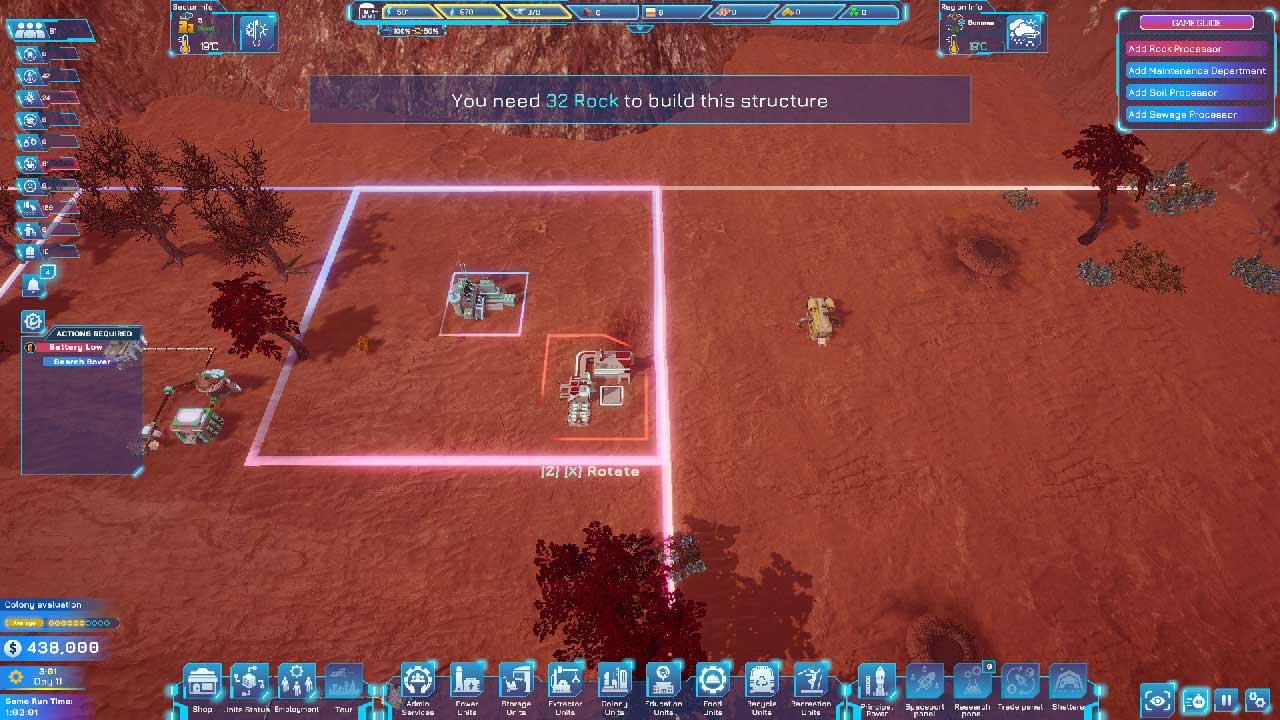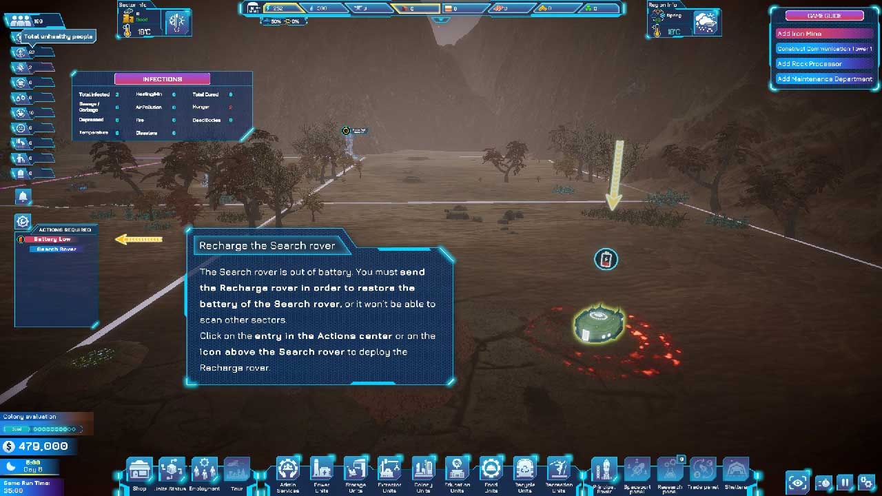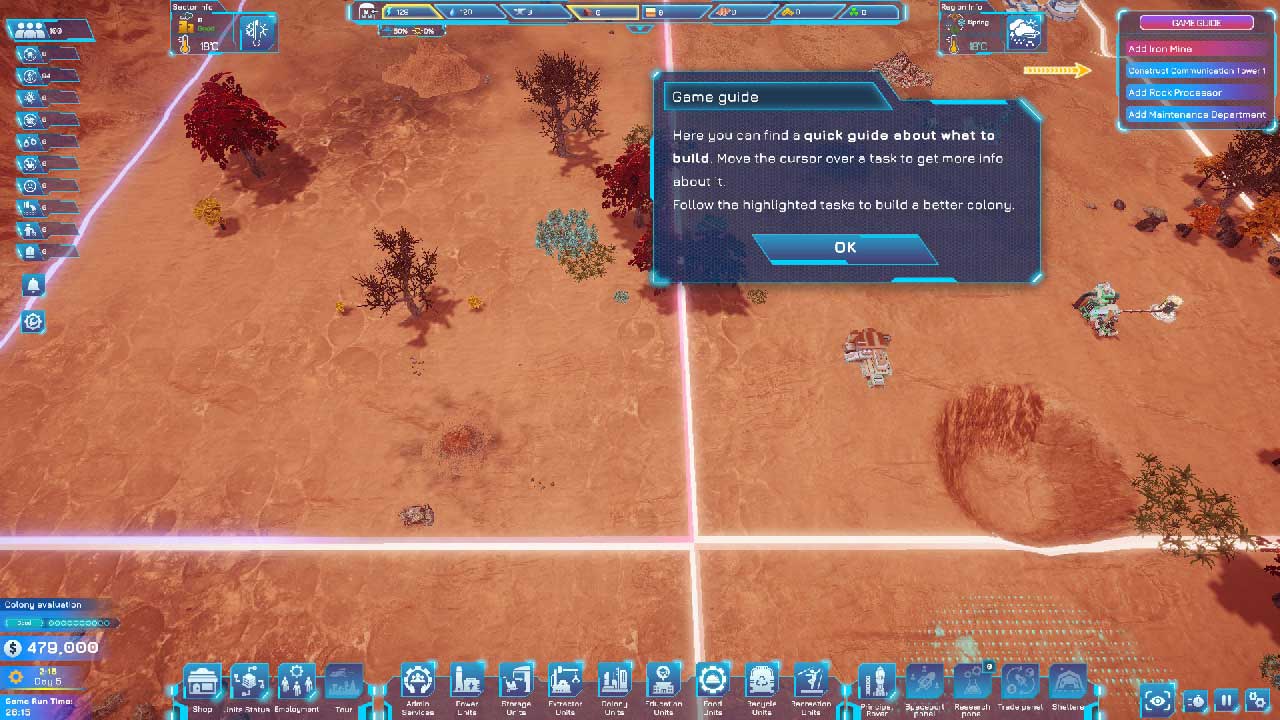 با به یاد آوردن لیست عظیم کارهایی که برای توسعه امپراتوری خود داشتم، به تازگی اولین آموزش را پشت سر گذاشتم. (البته همه این آموزش ها تماماً متنی هستند و صداگذاری نشده اند) برخی از مطالب مقدماتی به من اطلاع می دهد که ما به سلامت فرود آمده ایم، هوا قابل تنفس است و مریخ نورد جستجو منطقه را تقسیم می کند. وارد بخش ها شده و به دنبال منابع بگردید. من بلافاصله ۱۰۰ غیرنظامی تحت مراقبت یافتم، بنابراین زمانی برای تلف کردن وجود ندارد. این آموزش توضیح می دهد که شش مریخ نورد فنی که در بندر فضایی من لنگر انداخته اند، به دستور من، ساختمان هایی را مستقر کرده و می سازند. همچنین توجه من را به راهنمای بازی معطوف می کند. تا زمانی که من آن را دنبال کنم، این باید به آرامی پیش برود.
