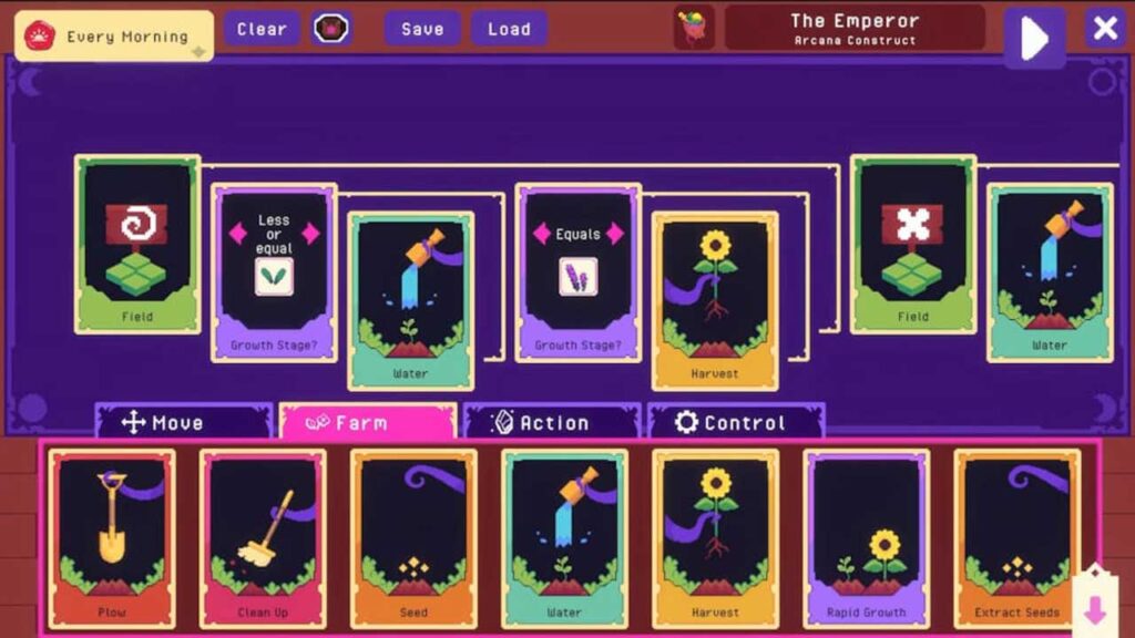 این جادو کردن در واقع نوعی برنامهنویسی است؛ با استفاده از کارتهای فرماندهی («برداشت»، «آب» و غیره)، سازههای شما تمام کارها را انجام میدهند – فقط باید آنها را برنامهریزی کنید، فعال کرده و نتایج را جمعآوری کنید. چیزی که نسبتاً ساده شروع میشود، به زودی با باز کردن گزینههایی مانند حلقهها، شرایط و تایمرها، به حوزههای پیچیدهتری تبدیل میشود و قبل از اینکه متوجه شوید، یک مزرعه کاملاً خودکار و معدن خواهید داشت که نیازی به لمس آن نخواهید داشت. این یک روش سرگرمکننده و جدید برای مدیریت گیمپلی کشاورزی است و به شما امکان میدهد وقت خود را در جای دیگری بگذرانید.