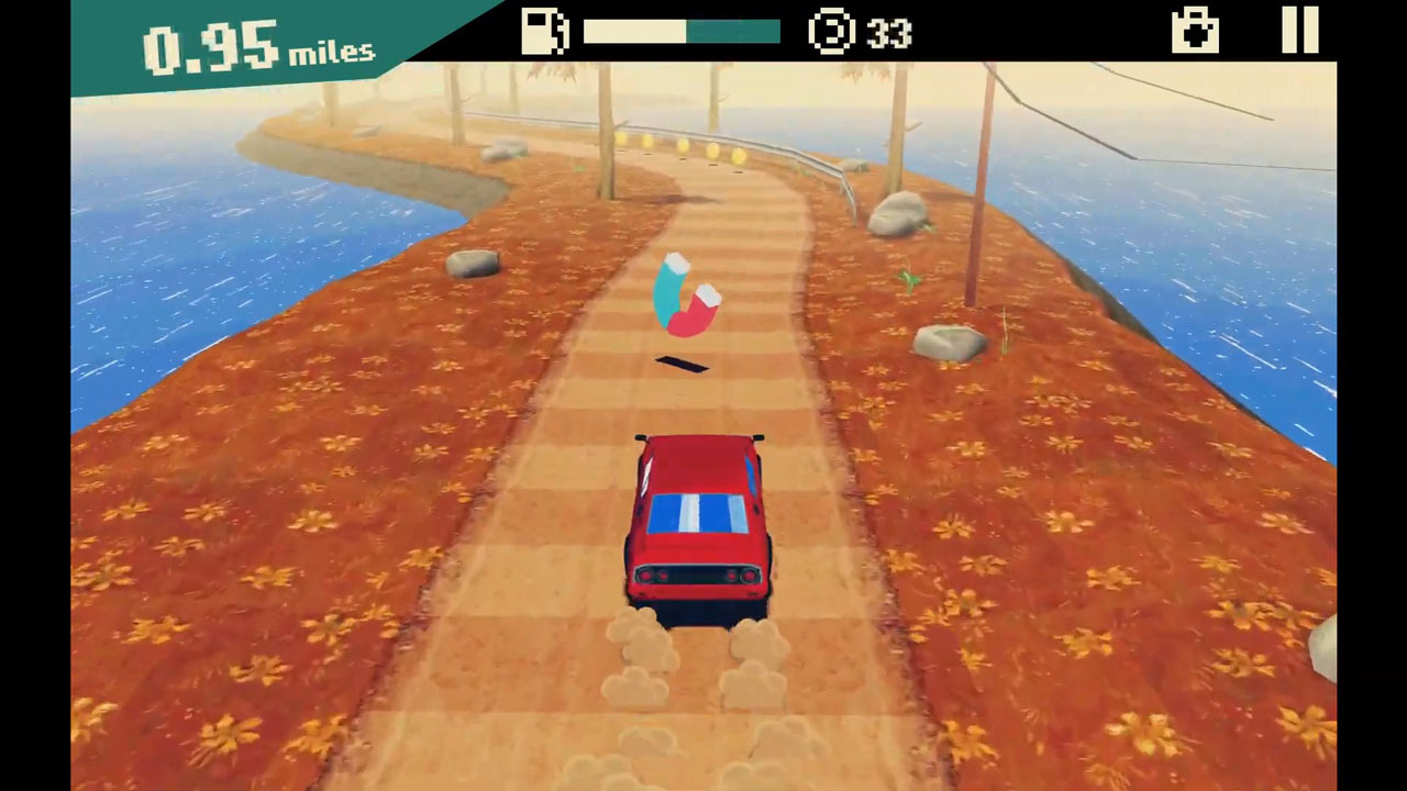 تمامی مسیرها یا جاده های بازی Seaside Driving به طور تصادفی تولید می شوند و با هر بار مردن، شرایط جاده ای جدیدی ایجاد می شود تا از یکنواخت شدن گیم پلی، تا جایی که امکان دارد جلوگیری شود. این یک ویژگی قابل توجه است که در کمتر بازی رانندگی مستقلی با آن مواجه شده ام. در حین رانندگی باید یکسری سکه ها را جمع آوری کنید تا از این طریق بتوانید به ماشین ها و جاده های جدید دسترسی پیدا کنید. یک آیتم جالب برای دریافت راحت تر سکه ها در نظر گرفته شده که یک آهنربا می باشد. به کمک این وسیله بدون نزدیک شدن به سکه ها می توانید از راه دور تمامی آنها را جمع آوری کنید.