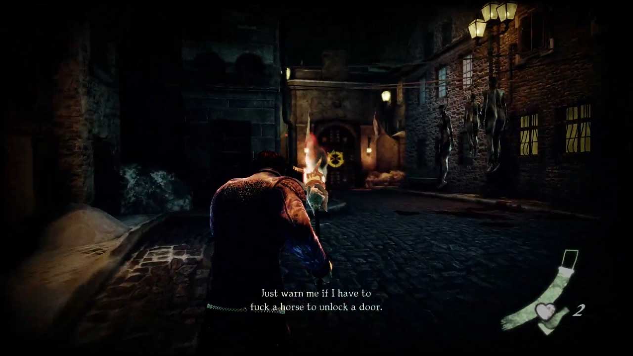 با این حال، نقاط قوت واقعی Shadows of the Damned در داستان، دیالوگ ها و زیبایی شناسی آن نهفته است. طنز بینظیر و محیط تخیلی دنیای اموات مثل همیشه سرگرمکننده است و به بازی هویتی منحصربهفرد میدهد که حتی امروزه نیز متمایز است. شخصیت پردازی گارسیا هاتسپر و جانسون واقعا عالی است و بیشتر بار موفقیت بازی روی همین ویژگی است. داستان بهخصوص عمیق یا لایهلایه نیست، اما پوچ بودن آن را در بر میگیرد و یک ماجراجویی خشن و بیهدف را ارائه میکند که مملو از طنز و کنایههای زبانی است.