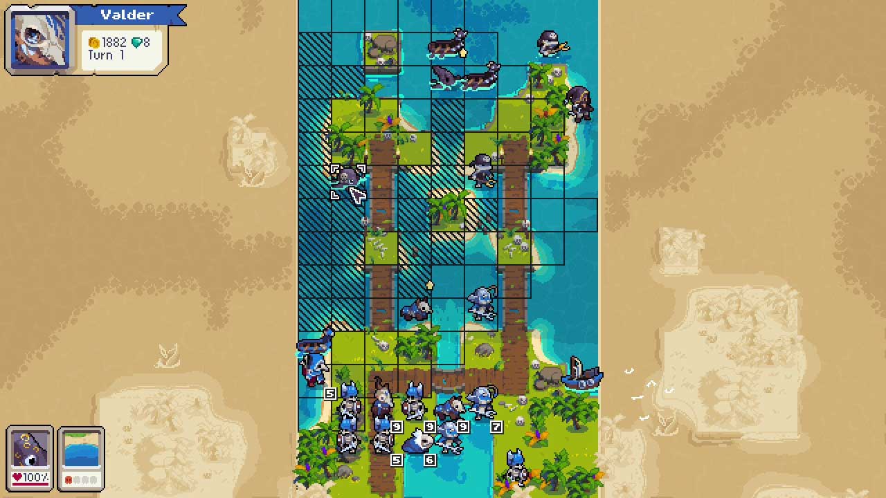 هر نقشه دارای زمین های متنوعی مانند جنگل ها، کوه ها و آب های کم عمق است. استراتژیک بودن با هر واحد و استفاده حداکثری از هر زمین می تواند به شما هواداران دفاع یا حمله بدهد و بازی را به بازی کاملاً پیشرفته شطرنج تبدیل کند. اگر مرتکب اشتباه شدید، می توانید حرکات را خنثی کنید. مهمترین جزء ارتش شما فرمانده شماست. اگر واحدها نابود شوند، مشکل بزرگی نیست، اما اگر فرمانده سقوط کند، بازی تمام شده است.
